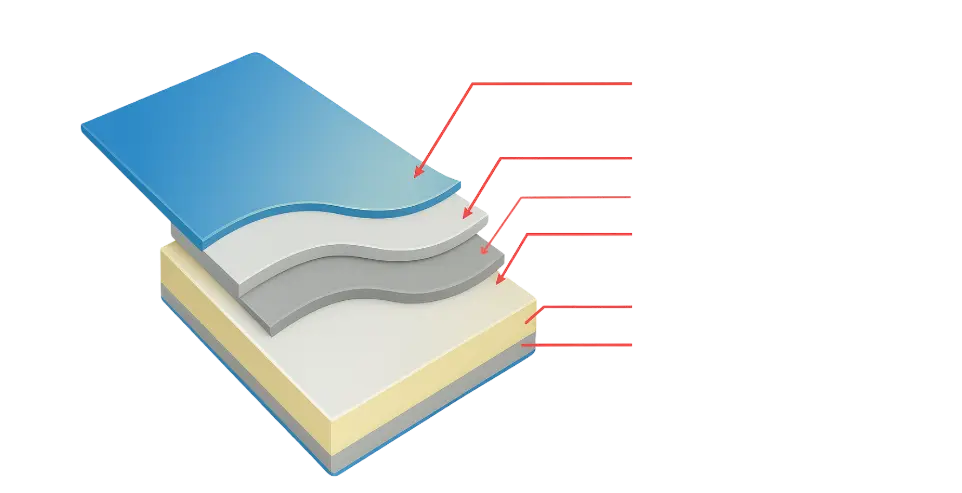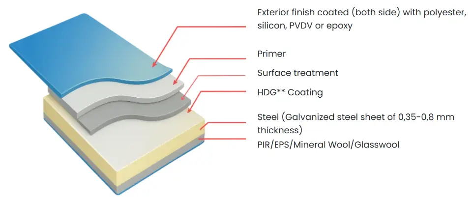Lapisan akhir eksterior (kedua sisi) dilapisi dengan poliester, silikon, PVDV atau epoksi