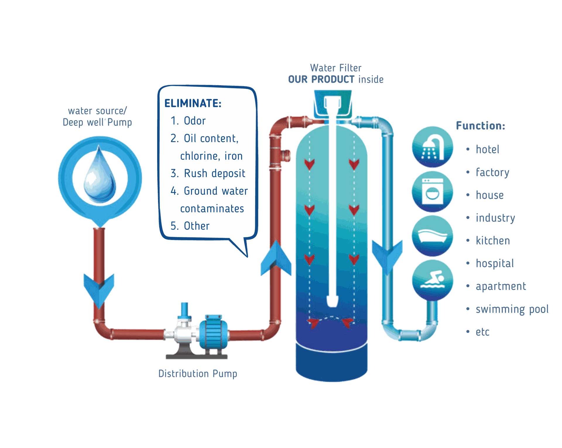 Menghilangkan partikel, berbagai zat dan logam terlarut seperti besi, merkuri, warna, kalsium, mangan, amoniak, nitrit, timbal, nitrat, materi, bau, kabut, dan zat terlarut berbahaya lainnya